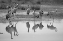 Im Frühnebel und im fahlen Morgenlicht verschwimmen die Konturen der Kraniche auf Lindes Fotos zu wie mit einem Aquarellpinsel gemalten Bildern. Schemenhaft verwischt fliegen Kraniche über noch im Wasser des Schlafplatzes verweilende Kranichgruppen hinweg.
